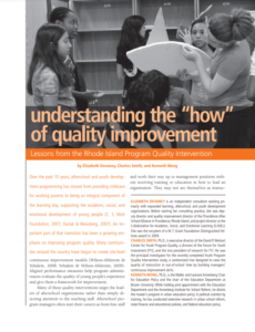 This research article discusses efforts to define and improve the quality of afterschool services, highlighting areas of agreement and identifying leading-edge issues. We conclude that the afterschool field is especially well positioned to deliver high-quality services and demonstrate effectiveness at scale because a strong foundation has been built for continuous improvement of service quality.